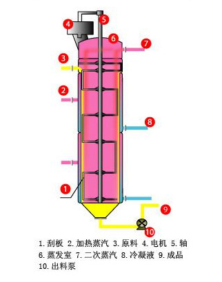 LGB刮板薄膜濃縮器,它的料液從上部和進料管,以穩(wěn)定流量進入,先經由轉軸帶動旋轉的分配盤,在離心力作用下,被拋向夾套加熱室的內壁,這時料液受重力作用,沿著器壁向下流動,在此同時,裝在轉軸上的刮板,把料液刮成薄膜,這樣料液受加熱面的加熱而蒸發(fā)。由于料液部在重力及離心的作用,不斷更新液膜,然后流集于底部。在濃縮過程所產生的二次蒸汽,可與濃縮液并流方向進入汽液分離器,分離排除,或者以逆流方向上長升到濃縮器頂部,經旋轉的帶孔葉板,把夾帶的液沫分離,從頂部排出,進入冷凝器。
