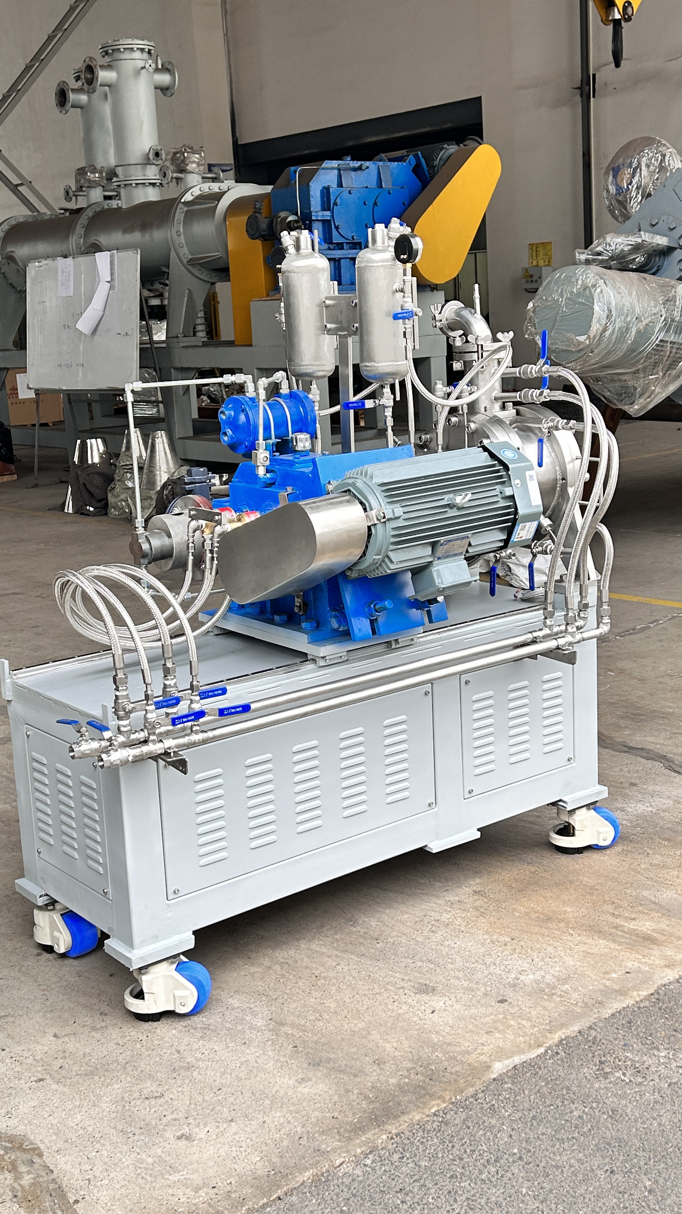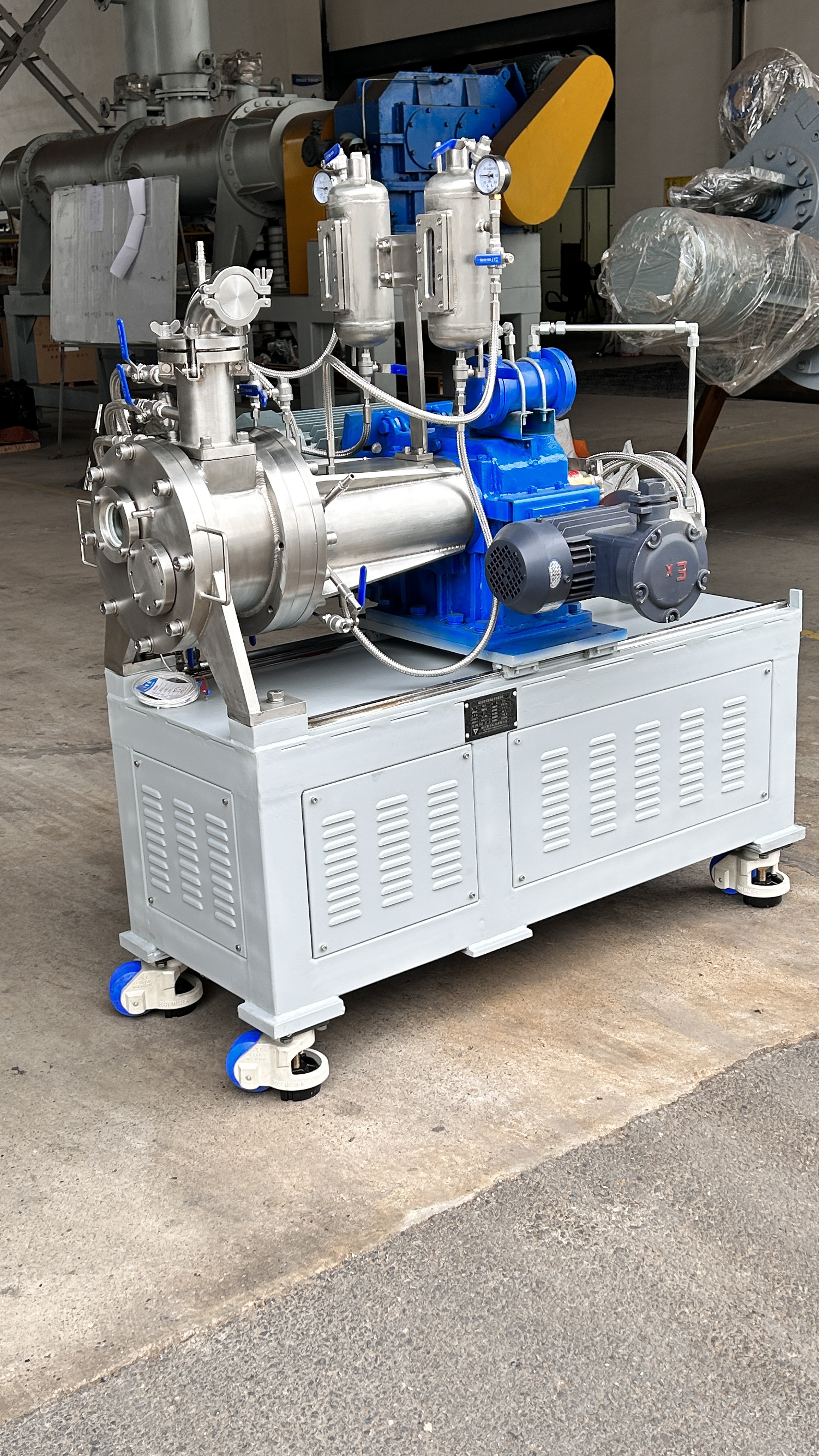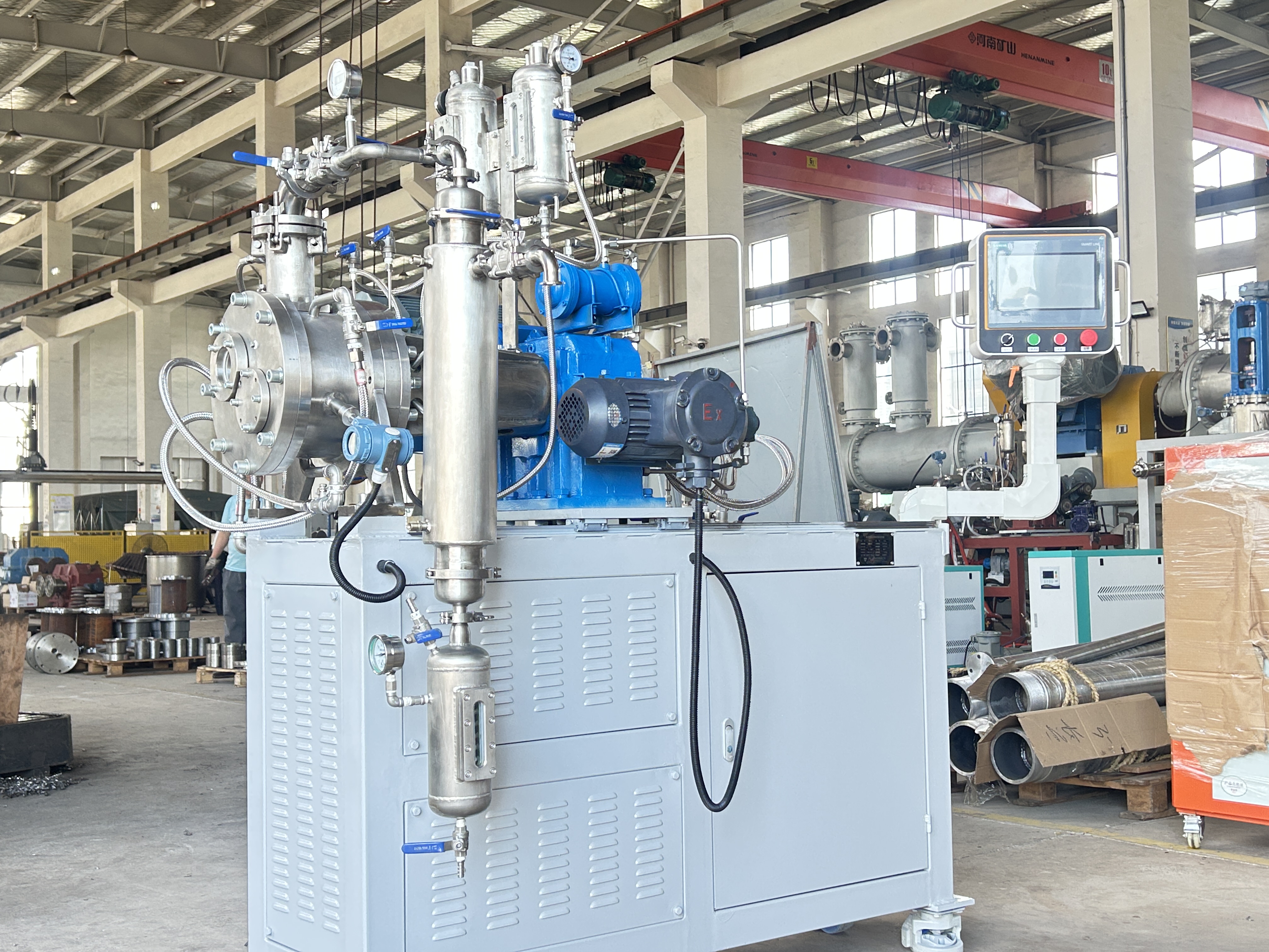 為了適應在真空狀態下的操作,專門安裝了適用于高粘度物料的齒輪泵式出料器。該出料器直接安裝在主設備上,消除了設備內的死角。齒輪泵式出料器在稍微超負荷的條件下工作,以保證物料能連續地排出,并輸入下一工段進行包裝。