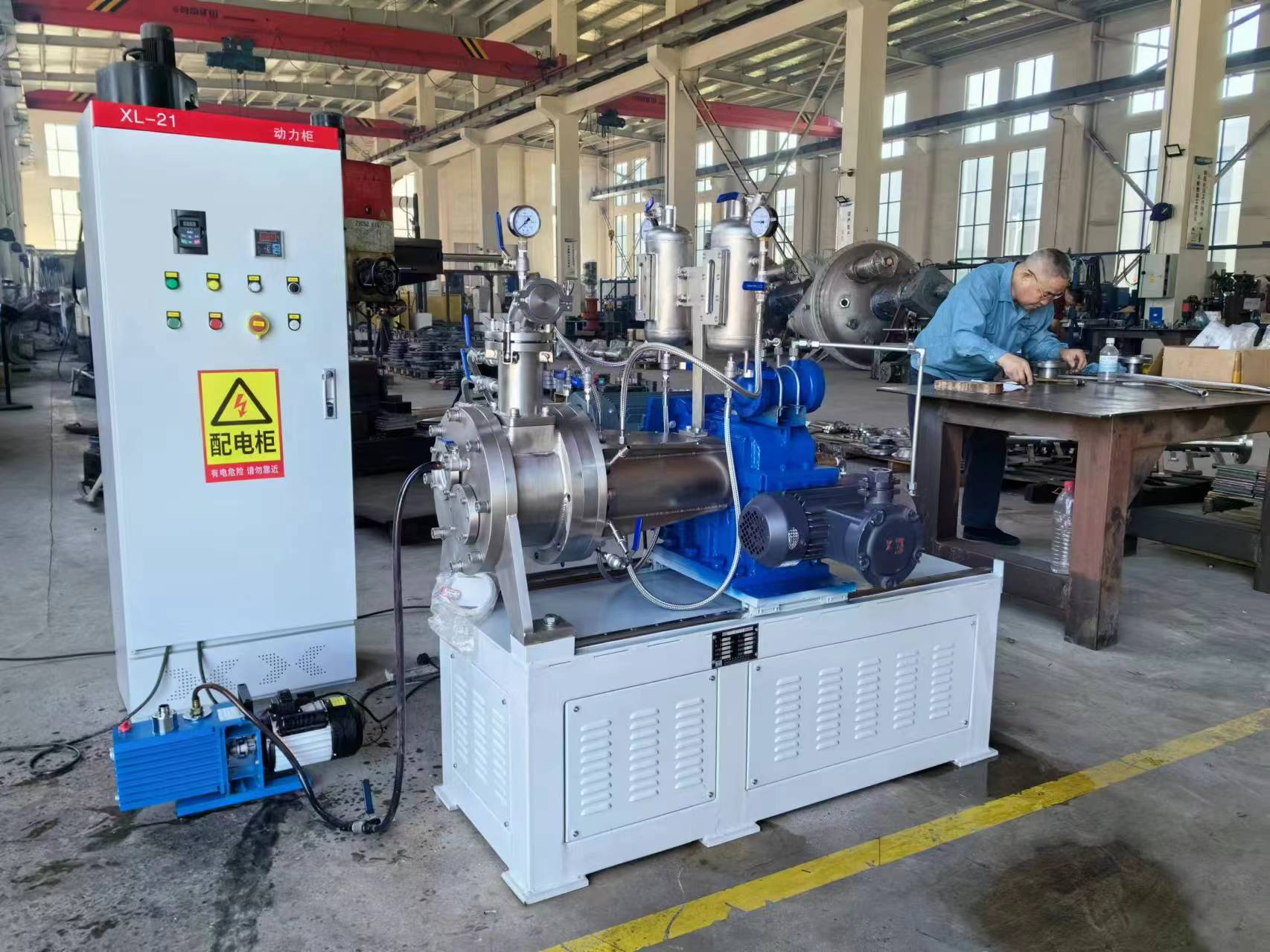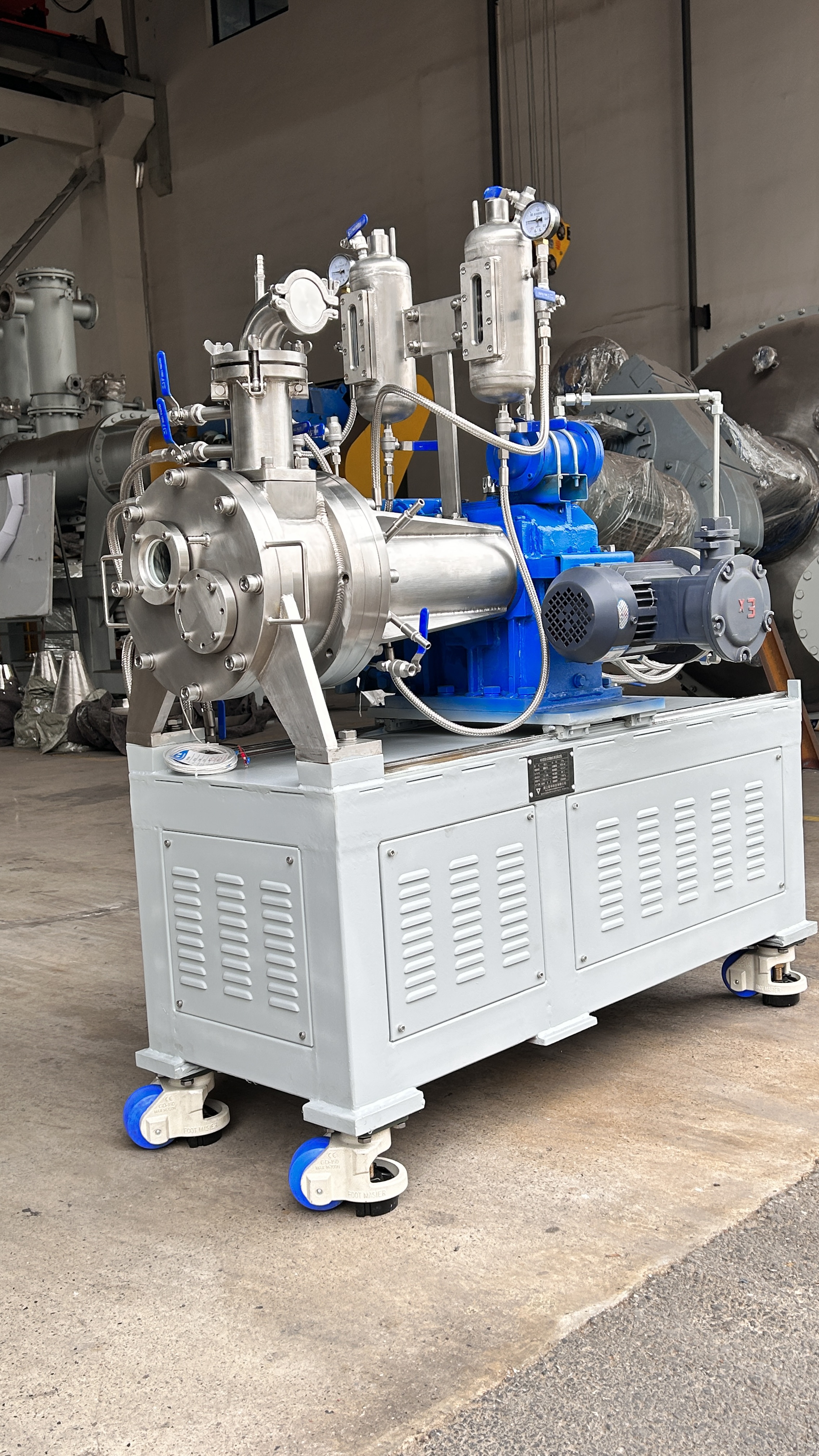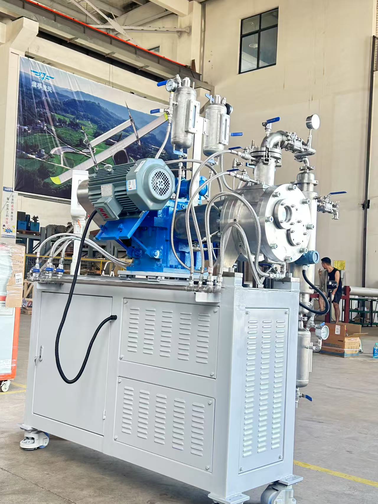 為了適應在真空狀態下的操作,專門安裝了適用于高粘度物料的齒輪泵式出料器。該出料器直接安裝在主設備上,消除了設備內的死角。齒輪泵式出料器在稍微超負荷的條件下工作,以保證物料能連續地排出,并輸入下一工段進行包裝。