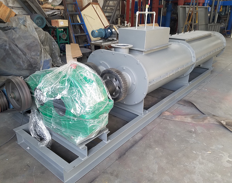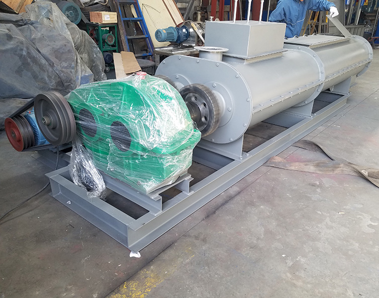 臥式雙軸混合機由臥式W形容器、帶(或者不帶)開口的頂蓋、安裝有槳葉并反向旋轉(zhuǎn)的雙軸、傳動單元、支撐架、密封件、出料結(jié)構(gòu)等部件組成。由于雙軸反向旋轉(zhuǎn),成一定角度的漿葉將物料沿軸向、徑向循環(huán)翻攪,使物料達到均勻混合的效果。物料在混合器內(nèi)的上拋運動形成流動層,產(chǎn)生瞬間失重。從而達到剪切、混合的效果。