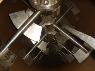 該機由擺線減速機直接驅動攪拌軸旋轉。攪拌軸由與筒體吻合的螺帶及實心螺旋組成,旋轉時,螺帶將物料由下向上沿反應釜筒體內壁盤旋提升。運轉時物料在其作用下產生了不規則的對流、剪切、摻混、擴散等,形成全方位的三維運動。攪拌軸的中心是一實心面體螺旋,在運轉時將靠中心的物料下壓,形成物料的大循環。如此不斷反復,使物料在短時間內達到均勻混合。