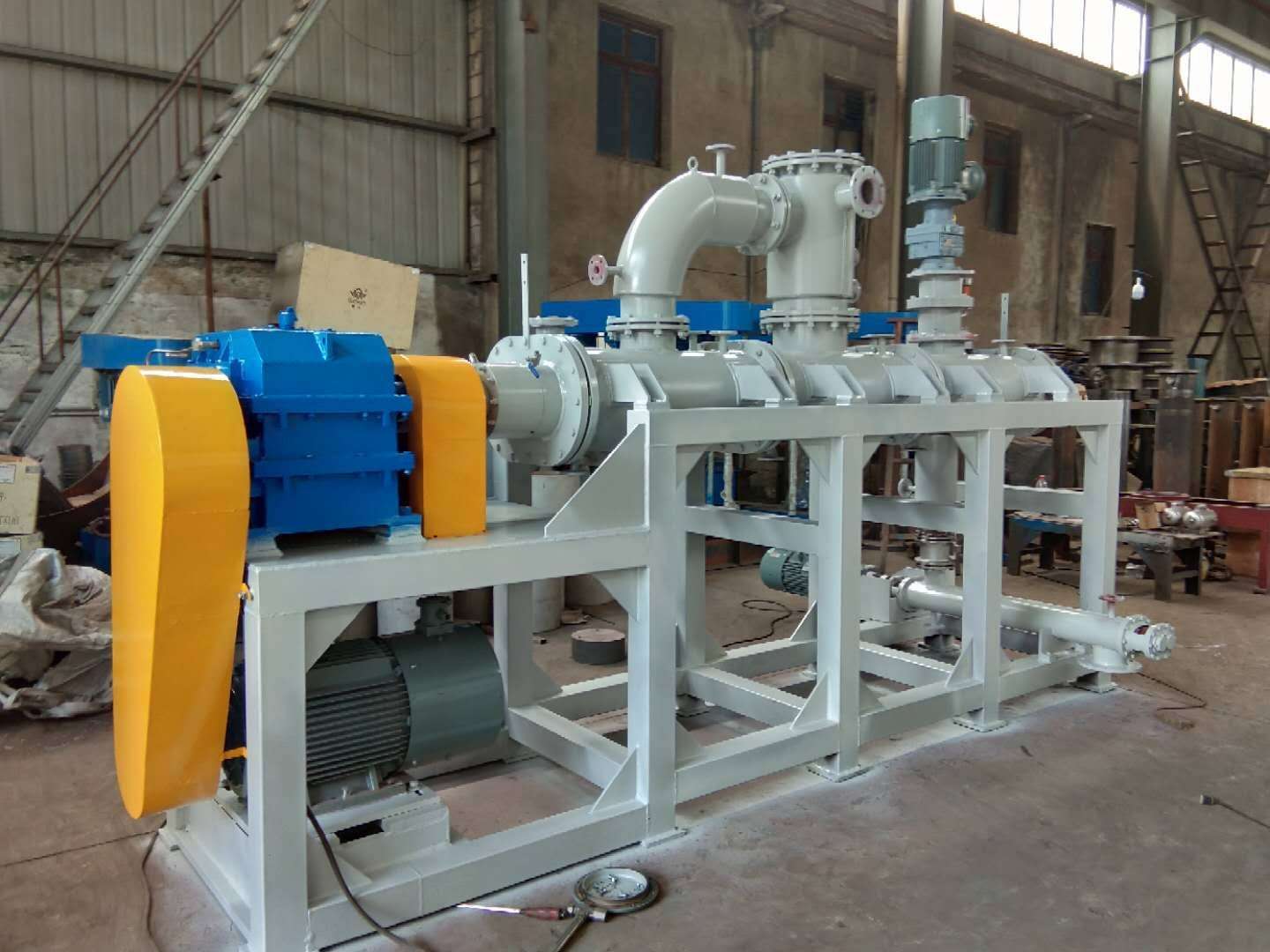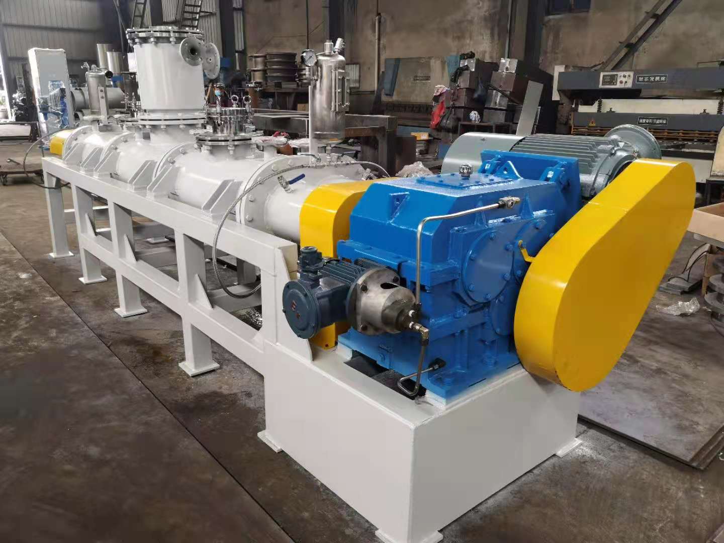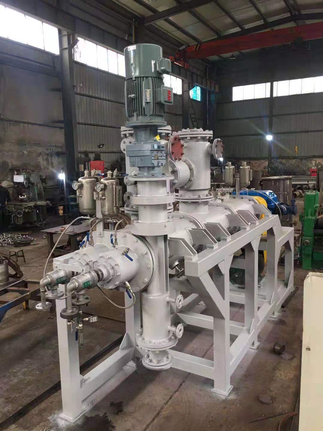 為了適應在真空狀態下的操作,專門安裝了適用于高粘度物料的齒輪泵式出料器。該出料器直接安裝在主設備上,消除了設備內的死角。齒輪泵式出料器在稍微超負荷的條件下工作,以保證物料能連續地排出,并輸入下一工段進行包裝。