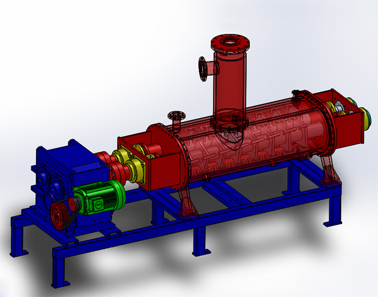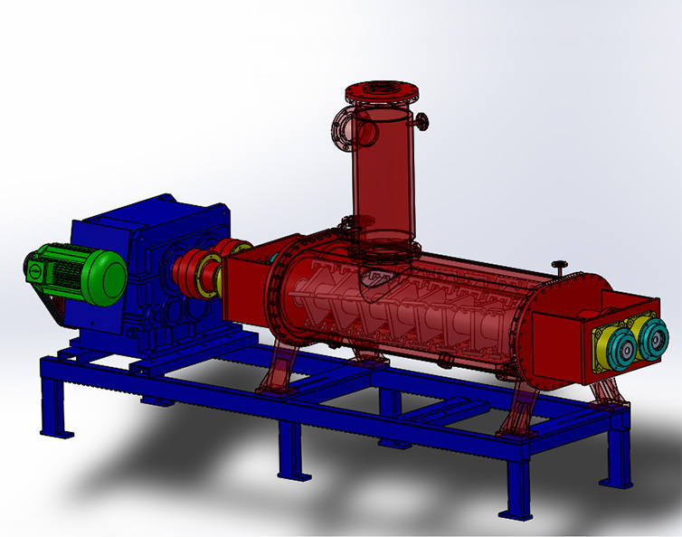 為了盡量增大單位設備容積的傳熱面積,WZS型自清潔脫揮器的殼體、攪拌軸和攪拌槳都通有導熱介質。強力的混合和捏合作用能有效地使物料更快地表面更新,該作用與具有自清潔功能的傳熱面相結合,從而確保熱、質傳遞所需的高表面更新速率。
