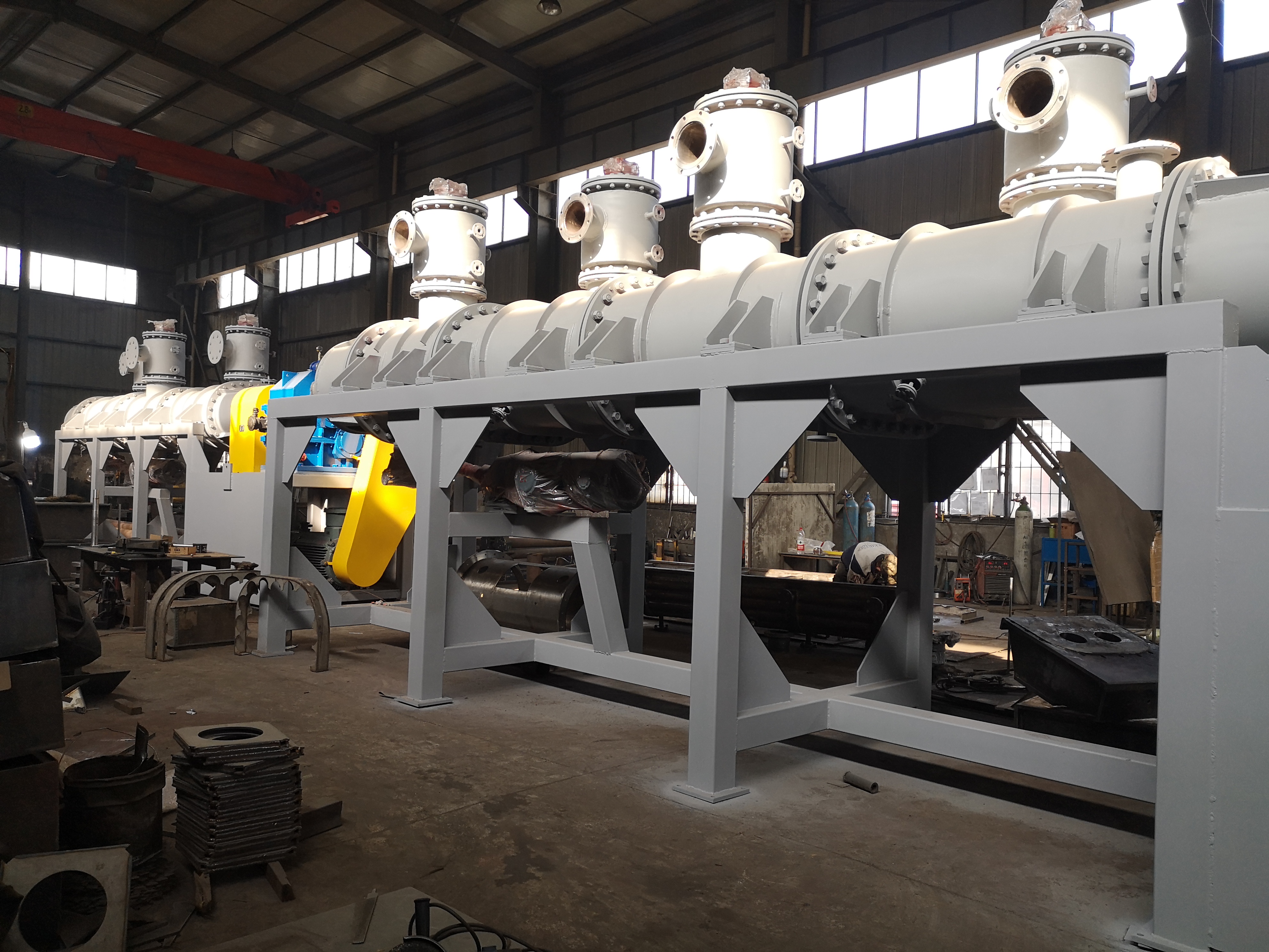 為了盡量增大單位設(shè)備容積的傳熱面積,WZS型自清潔脫揮器的殼體、攪拌軸和攪拌槳都通有導(dǎo)熱介質(zhì)。強力的混合和捏合作用能有效地使物料更快地表面更新,該作用與具有自清潔功能的傳熱面相結(jié)合,從而確保熱、質(zhì)傳遞所需的高表面更新速率。