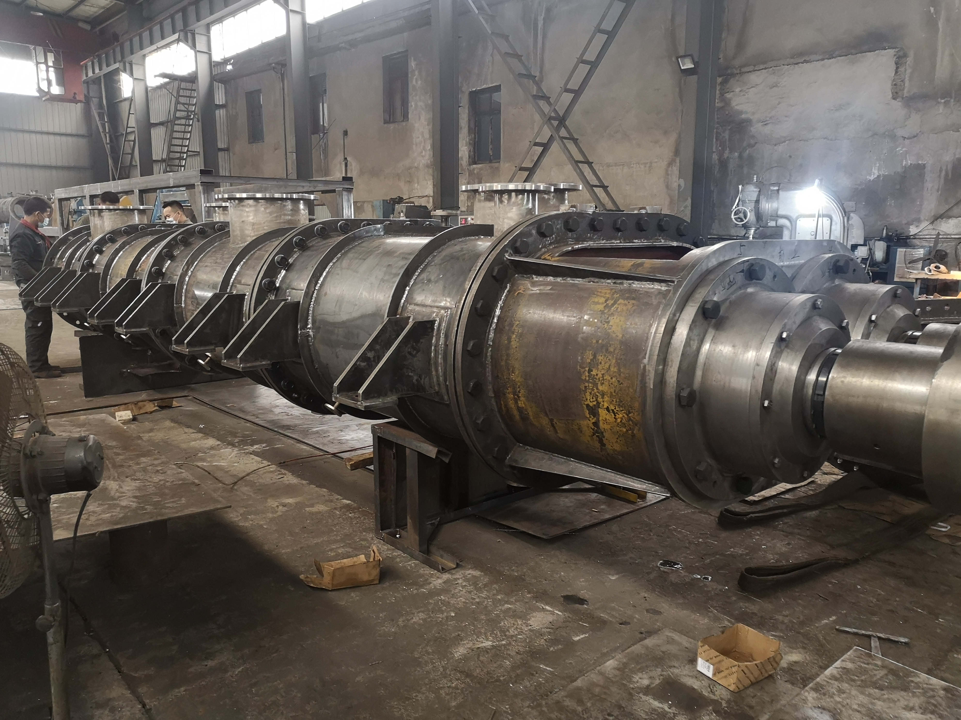 .混合機除夾套有傳熱功能,其主要的傳熱單元還是攪拌軸和攪拌盤,攪拌軸和槳盤中間設(shè)計是空心的,能通入0-300℃?zhèn)鳠峤橘|(zhì)循環(huán),加上攪拌軸的旋轉(zhuǎn),單位時間內(nèi)物料接觸換熱面積增加,使該混合設(shè)備具有高效的傳熱能力.是高粘流體物料反應(yīng),蒸發(fā),干燥,脫輝的首選裝置。
